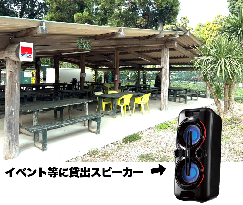 大型の丈夫なテント。強い日差し、急な雨でも平気です。照明、電源コンセント設置してあります。